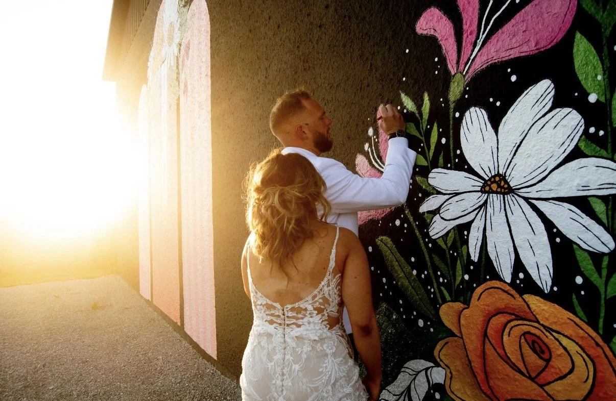 This personal touch makes the mural a true reflection of the heart behind our space—family, legacy and love. It has quickly become a favorite spot for couples and guests, whether golden-hour portraits, bridal party moments, or just capturing the beauty of the day.