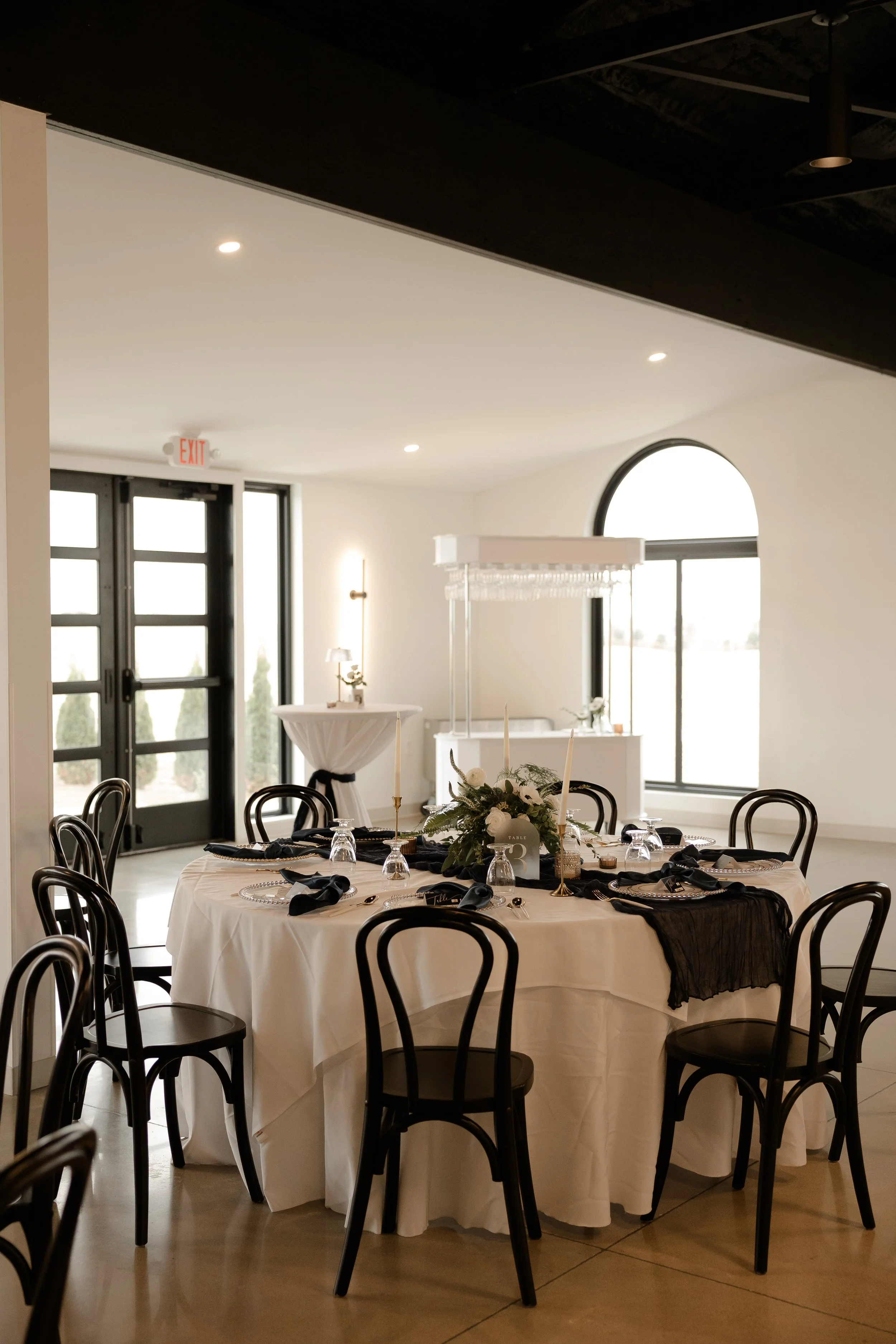 • White & black table linens included